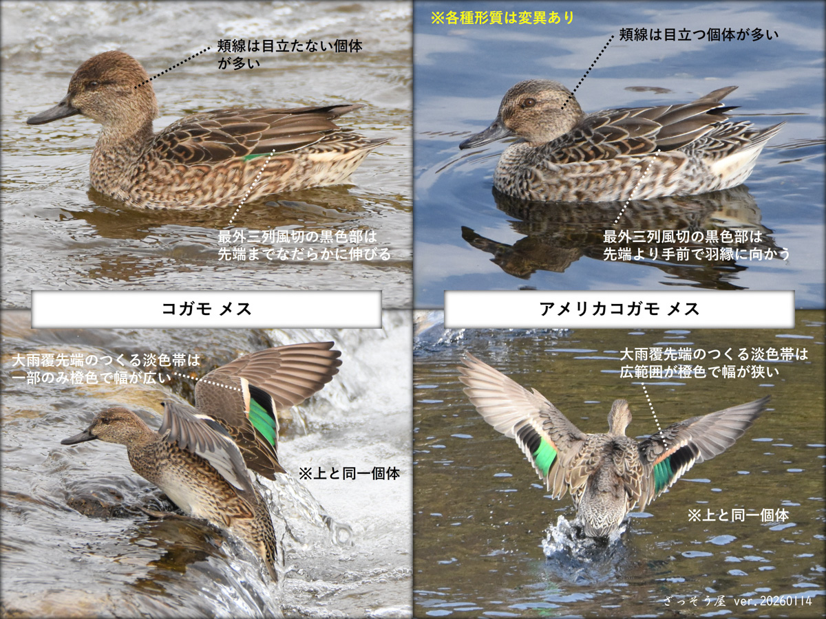 また、頬線がアメリカコガモのほうが強く出る傾向があるが、個体差が大きい1)。